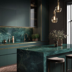 หินสีเขียวมรกตที่โดดเด่นด้วยลวดลายเส้นแร่สีเขียวเข้ม–อ่อนสลับกัน ราวกับงานศิลป์ที่ธรรมชาติสร้างขึ้น เนื้อหินมีความแวววาว เมื่อสะท้อนกับแสงไฟหรือแสงธรรมชาติจะยิ่งขับให้ห้องดูหรูหราสง่างาม